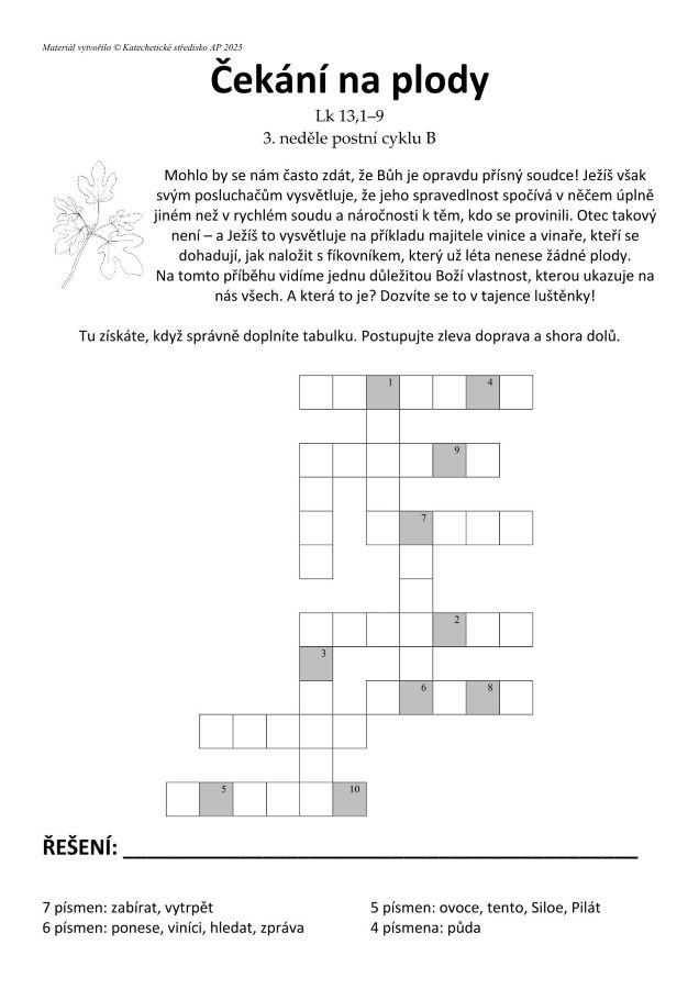 Křížovka ve formátu kris-kros vhodná jako úvodní či závěrečná aktivita k tématu podobenství, eschatologie, případně jako doplněk k přípravě na 3. neděli postní cyklu B. Vhodné i pro samostatnou práci dětí. Střední náročnost. Signatura G-2-682.