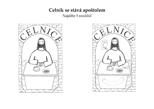 Luštěnka - hledání rozdílů vhodná jako úvodní či závěrečná aktivita k tématu apoštolové, povolání, obrácení, případně jako doplněk k přípravě na 10. neděli v mezidobí cyklu A. Vhodné i pro samostatnou práci dětí. Nízká náročnost. Signatura G-5-669.