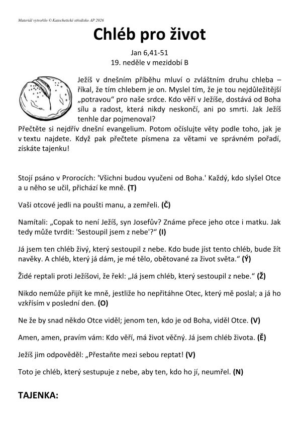 Kvízová šifra vhodná jako úvodní či závěrečná aktivita k tématu Ježíšovo učení, eucharistie, případně jako doplněk k přípravě na 19. neděli v mezidobí cyklu B. Vhodné i pro samostatnou práci dětí. Střední náročnost. Signatura B-4-672.