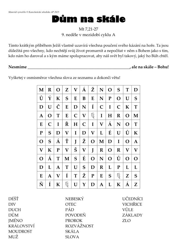 Osmisměrka vhodná jako úvodní či závěrečná aktivita k tématu podobenství, kázání na hoře, Boží vůle, případně jako doplněk k přípravě na 9. neděli v mezidobí cyklu A. Vhodné i pro samostatnou práci dětí. Střední náročnost. Signatura G-2-683.
