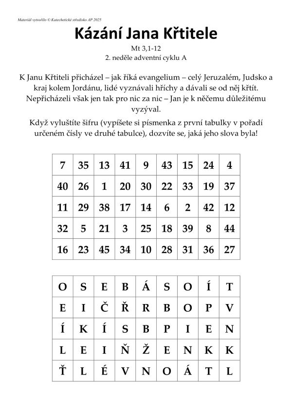 Šifra vhodná jako úvodní či závěrečná aktivita k tématu advent, Jan Křtitel, Ježíšův křest, případně jako doplněk k přípravě na 2. neděli adventní cyklu A. Vhodné i pro samostatnou práci dětí. Střední náročnost. Signatura G-4-660.