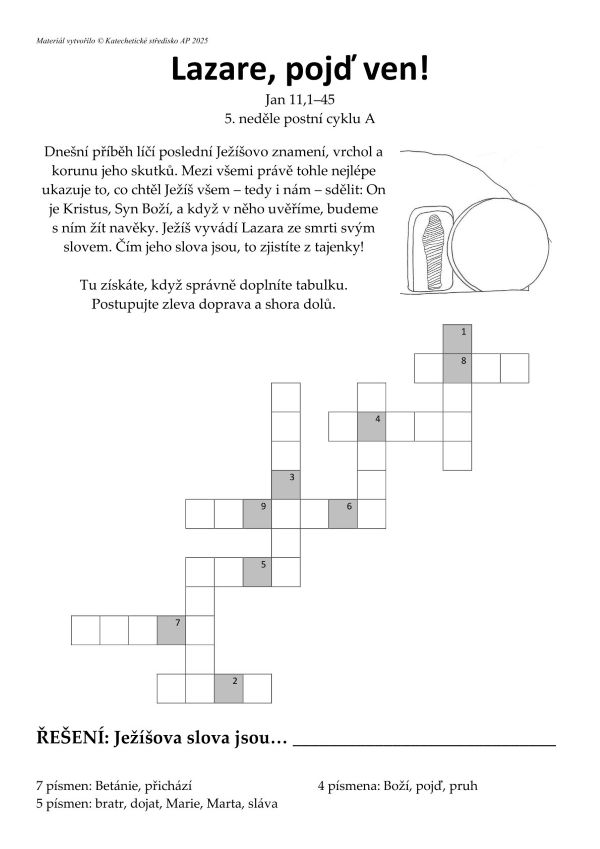 Křížovka ve formátu kris-kros vhodná jako úvodní či závěrečná aktivita k tématu podobenství, eschatologie, případně jako doplněk k přípravě na 3. neděli postní cyklu B. Vhodné i pro samostatnou práci dětí. Střední náročnost. Signatura G-2-682.