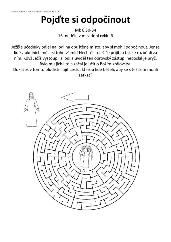 Luštěnka typu bludiště vhodná jako úvodní či závěrečná aktivita k tématu Ježíšův život, hlásání Božího království, křesťanský život, případně jako doplněk k přípravě na 16. neděli v mezidobí cyklu B. Vhodné i pro samostatnou práci dětí. Střední náročnost. Signatura G-1-779. Řešení na rubu luštěnky.