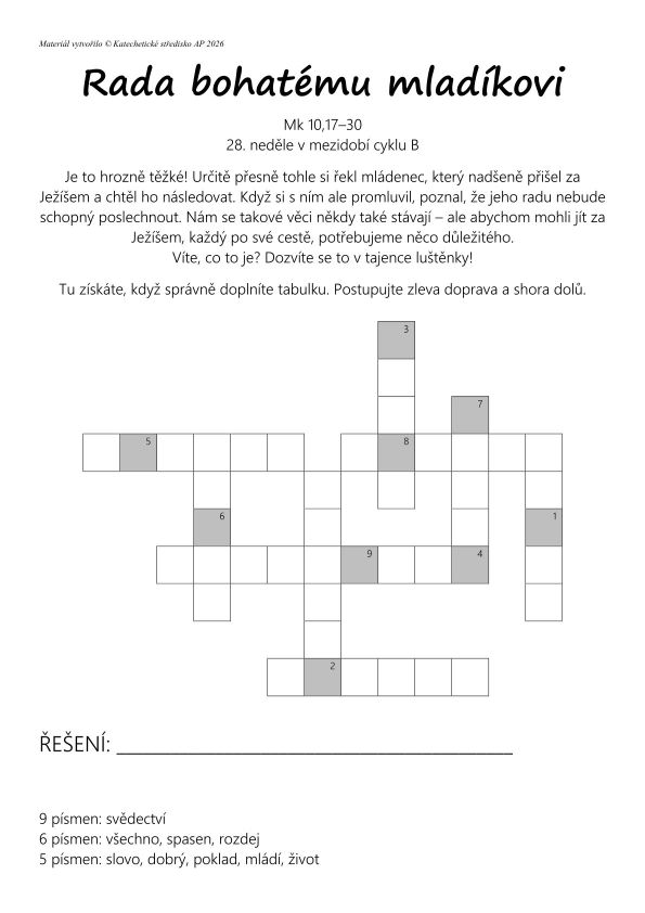 Křížovka ve formátu kris-kros vhodná jako úvodní či závěrečná aktivita k tématu následování, Boží království, případně jako doplněk k přípravě na 28. neděli v mezidobí cyklu B. Vhodné i pro samostatnou práci dětí. Střední náročnost. Signatura G-1-777.