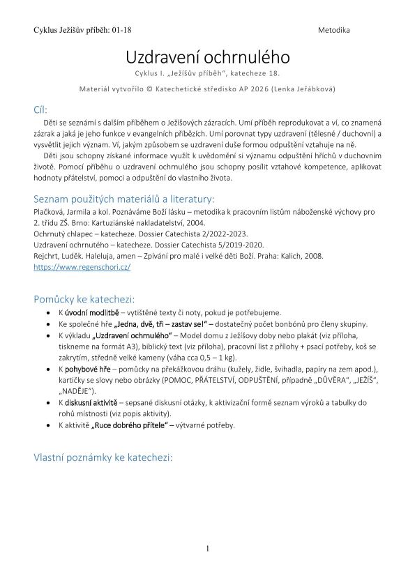 Děti se seznámí s dalším příběhem o Ježíšových zázracích. Umí příběh reprodukovat a ví, co znamená zázrak a jaká je jeho funkce v evangelních příbězích. Umí porovnat typy uzdravení (tělesné / duchovní) a vysvětlit jejich význam. Ví, jakým způsobem se uzdravení duše formou odpuštění vztahuje na ně.